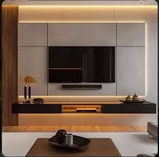 Custom TV consoles and entertainment wall designs incorporating gypsum, wood, lighting, and wall cladding for a sleek, modern, and functional living space.